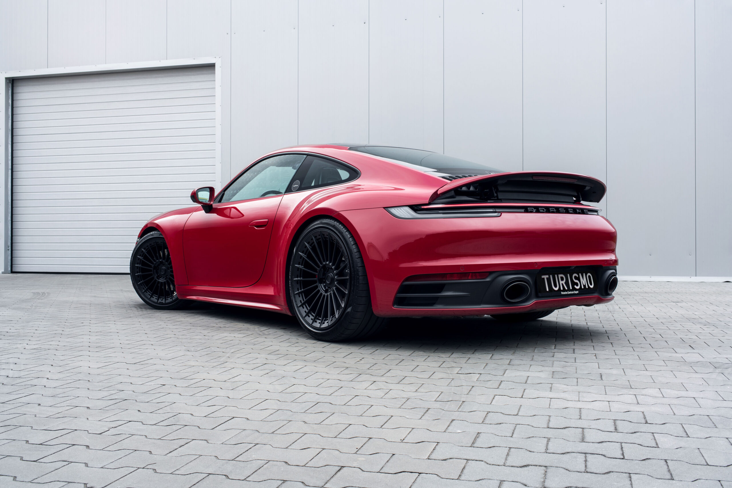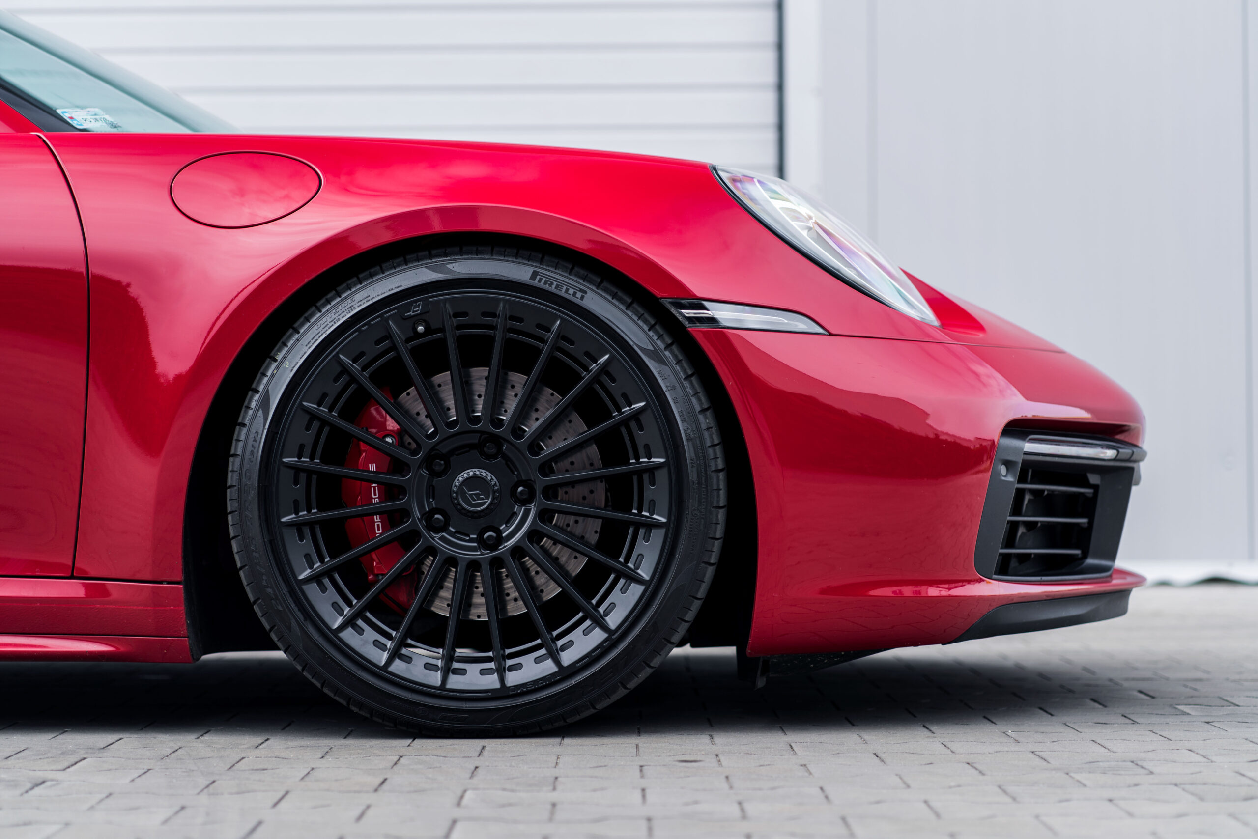 The Porsche 911 (992) 4S was equipped with Turismo Forged C14 alloy wheels, made of forged 6061 aluminum. The presented monoblock wheels feature a modern, 20-spoke design with an effective aero ring that emphasizes their sporty character.