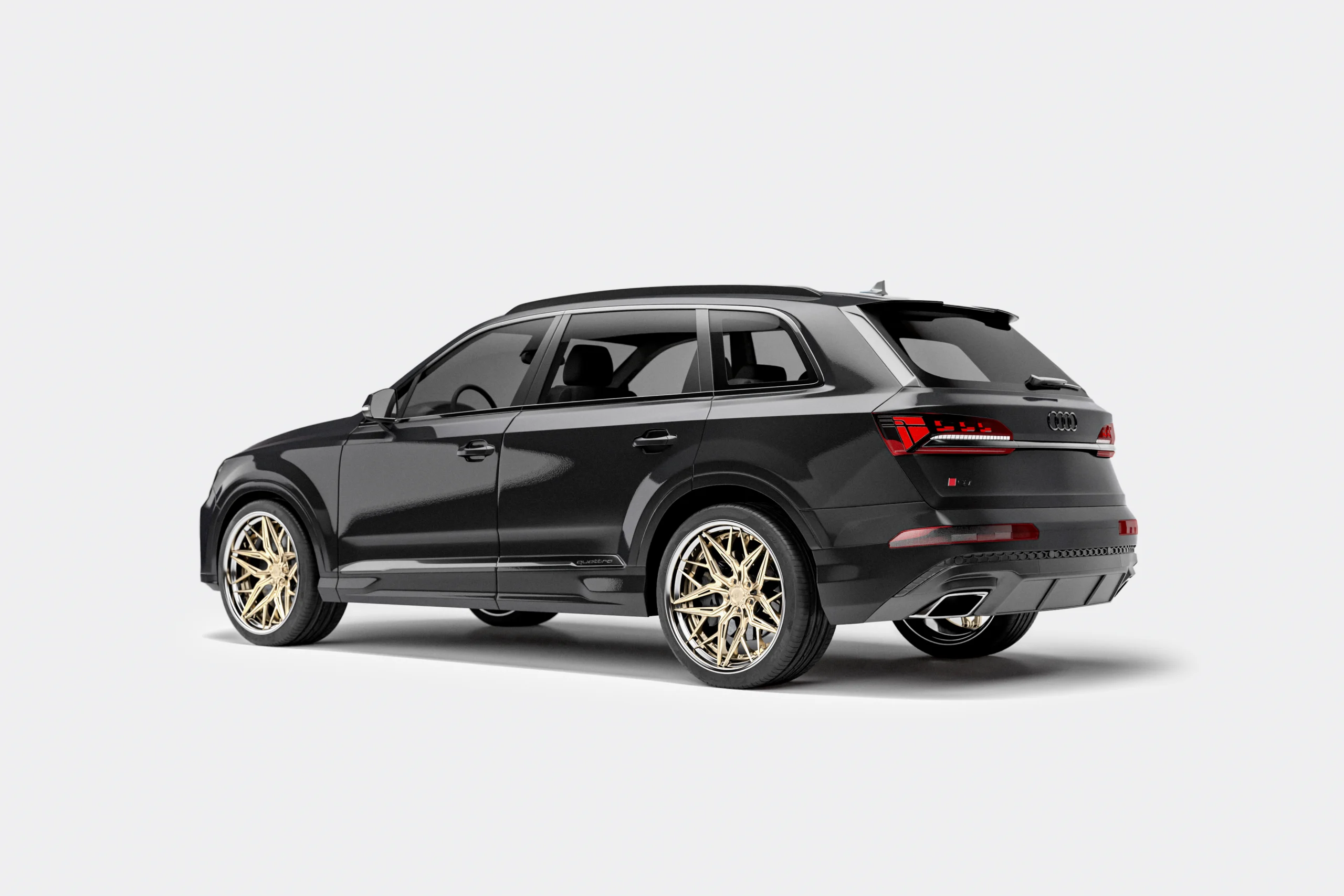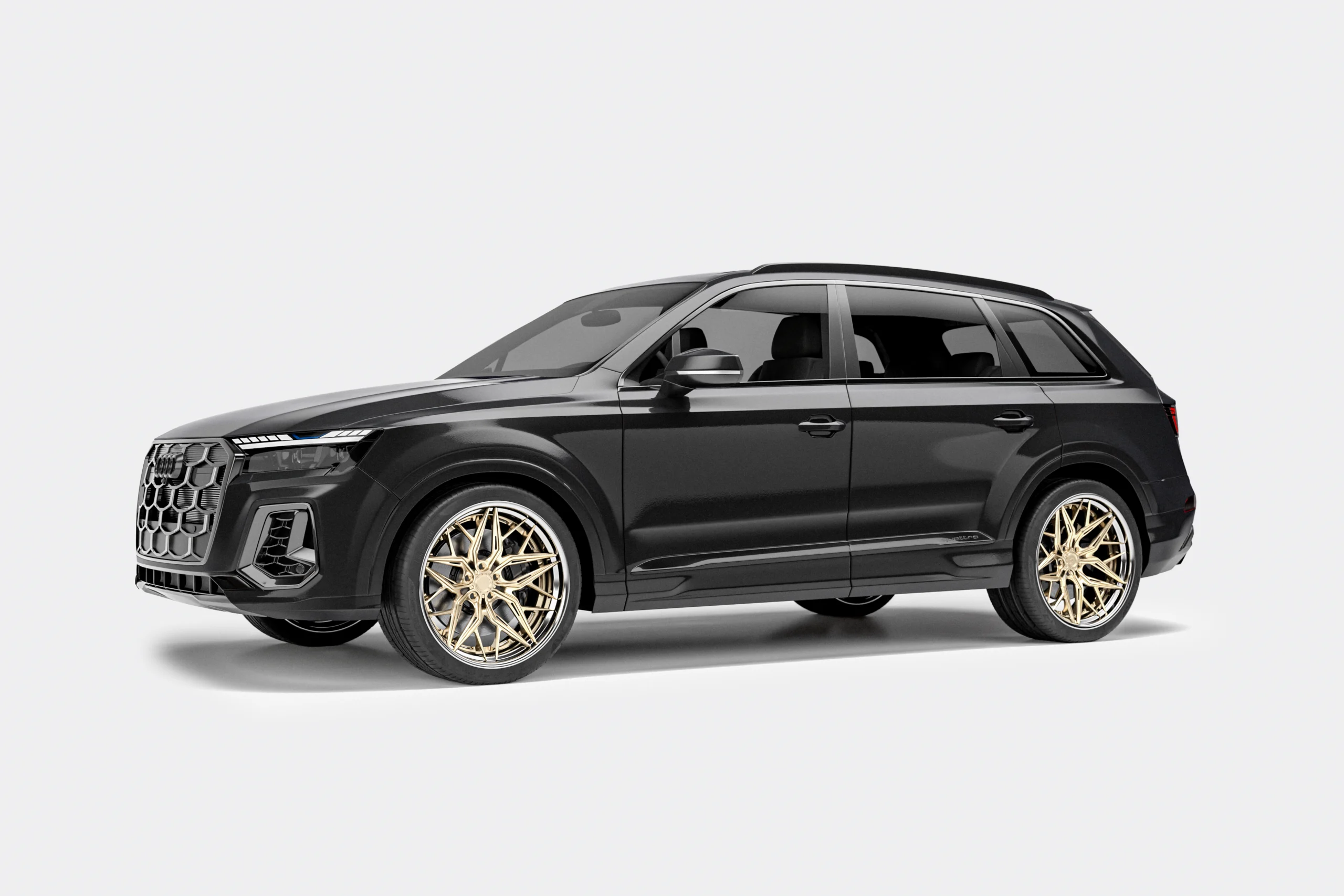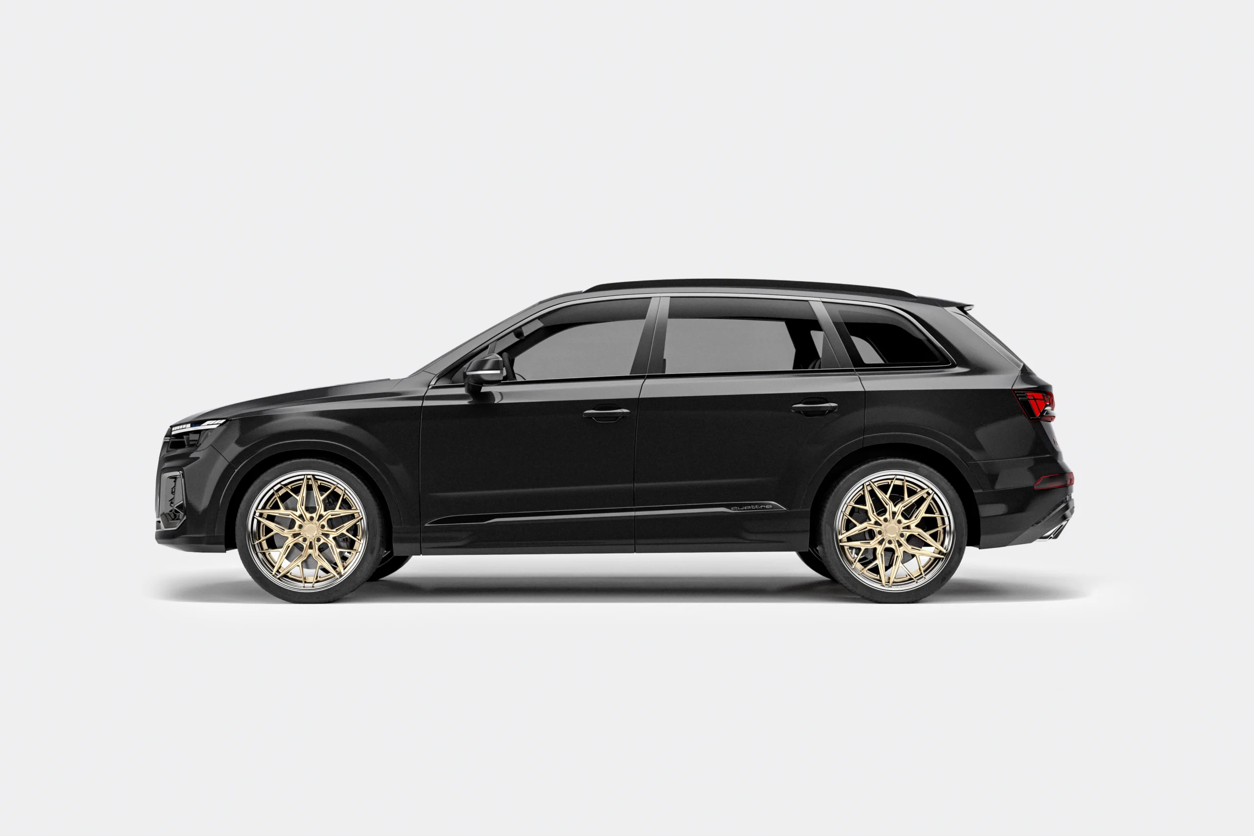 Do czarnego egzemplarza Audi Q7 wybraliśmy felgi Turismo Forged NT – dwuczęściowe, skręcane felgi kute, wykonane z najwyższej jakości kutego aluminium 6061-T6. Połączenie rotora w kolorze Satin Gold z rantobębnem w wykończeniu Chrome tworzy wyjątkowy kontrast, który doskonale podkreśla elegancką, a zarazem dynamiczną naturę SUV-a. To zestawienie luksusu i sportowego charakteru w najbardziej dopracowanej formie.