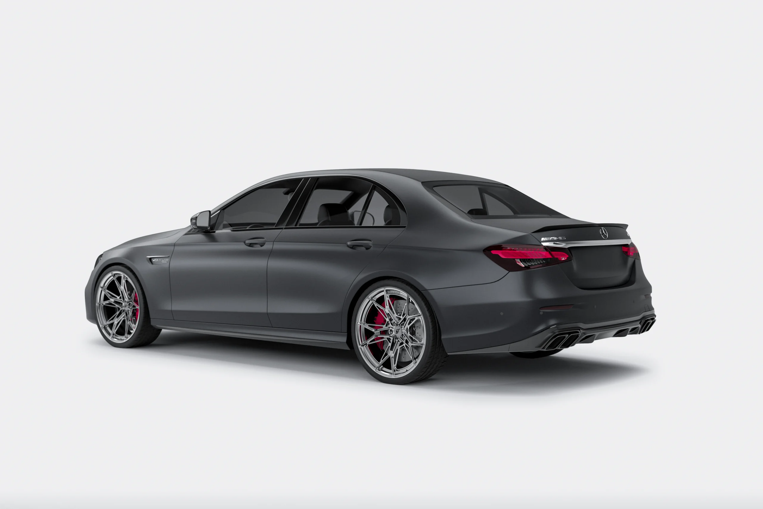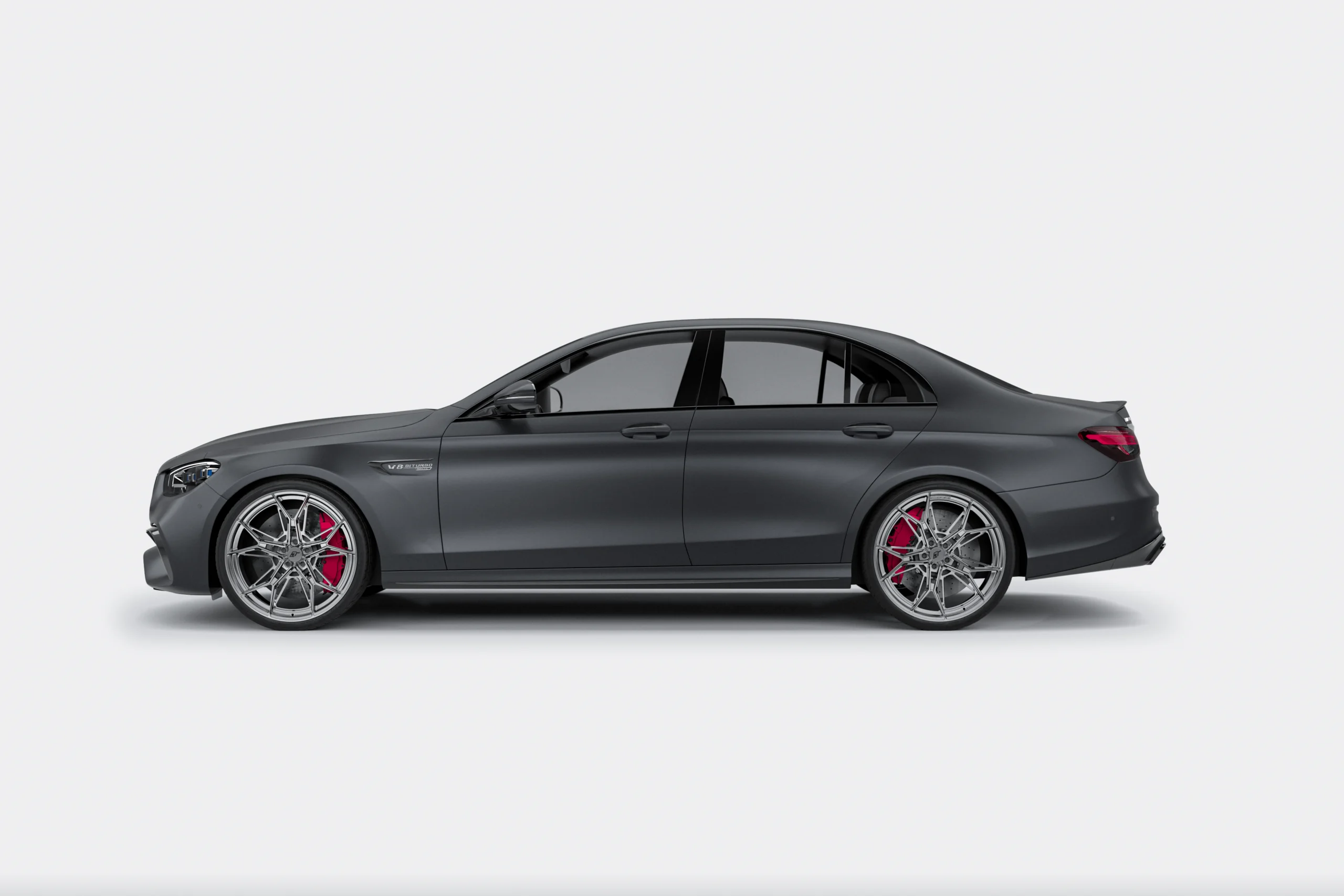 W satynowo-grafitowym Mercedes-Benz E W214 E63S zastosowaliśmy felgi kute Turismo C01.EVO w kolorze Gloss Silver — to konfiguracja nastawiona na estetyczną spójność klasy premium.