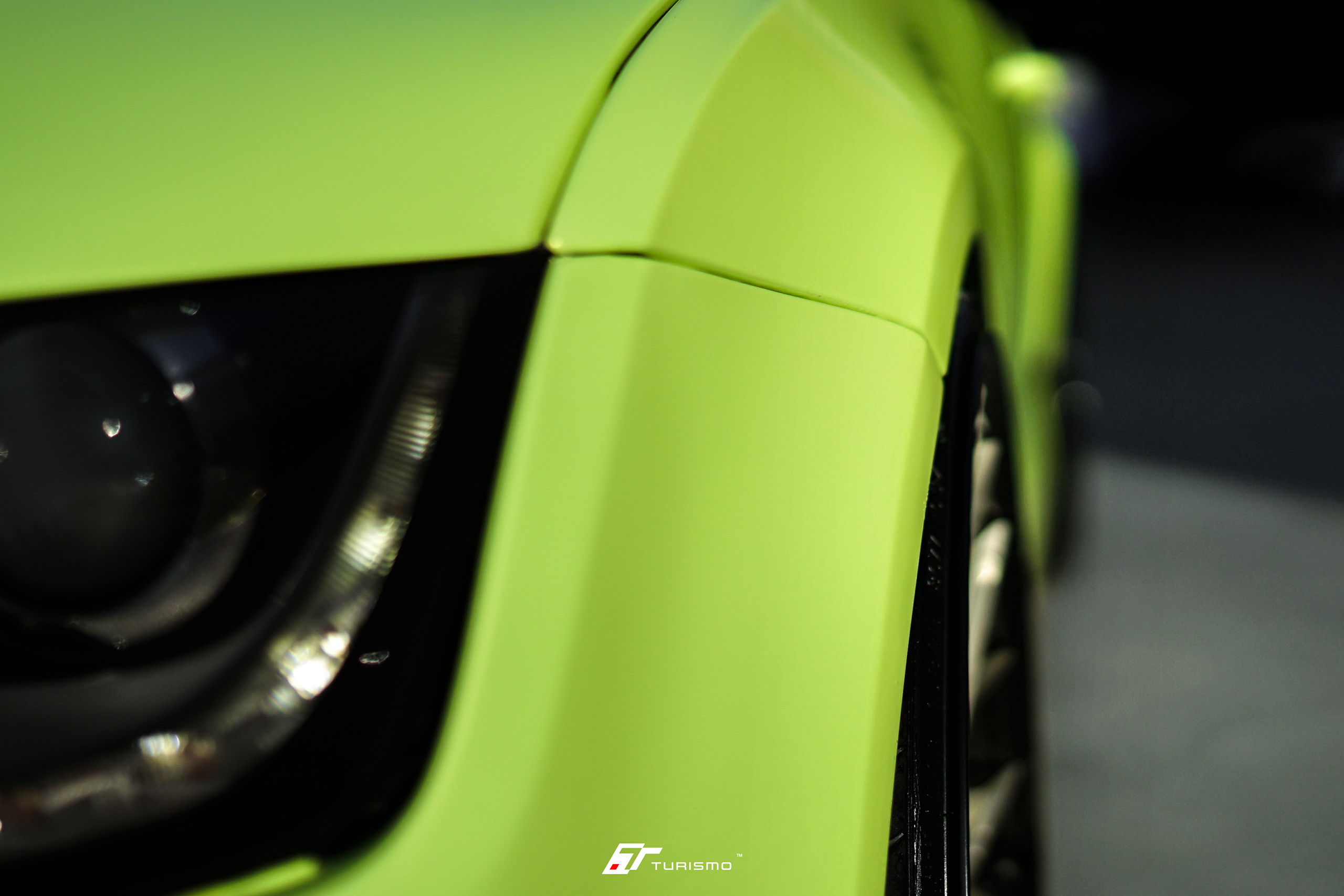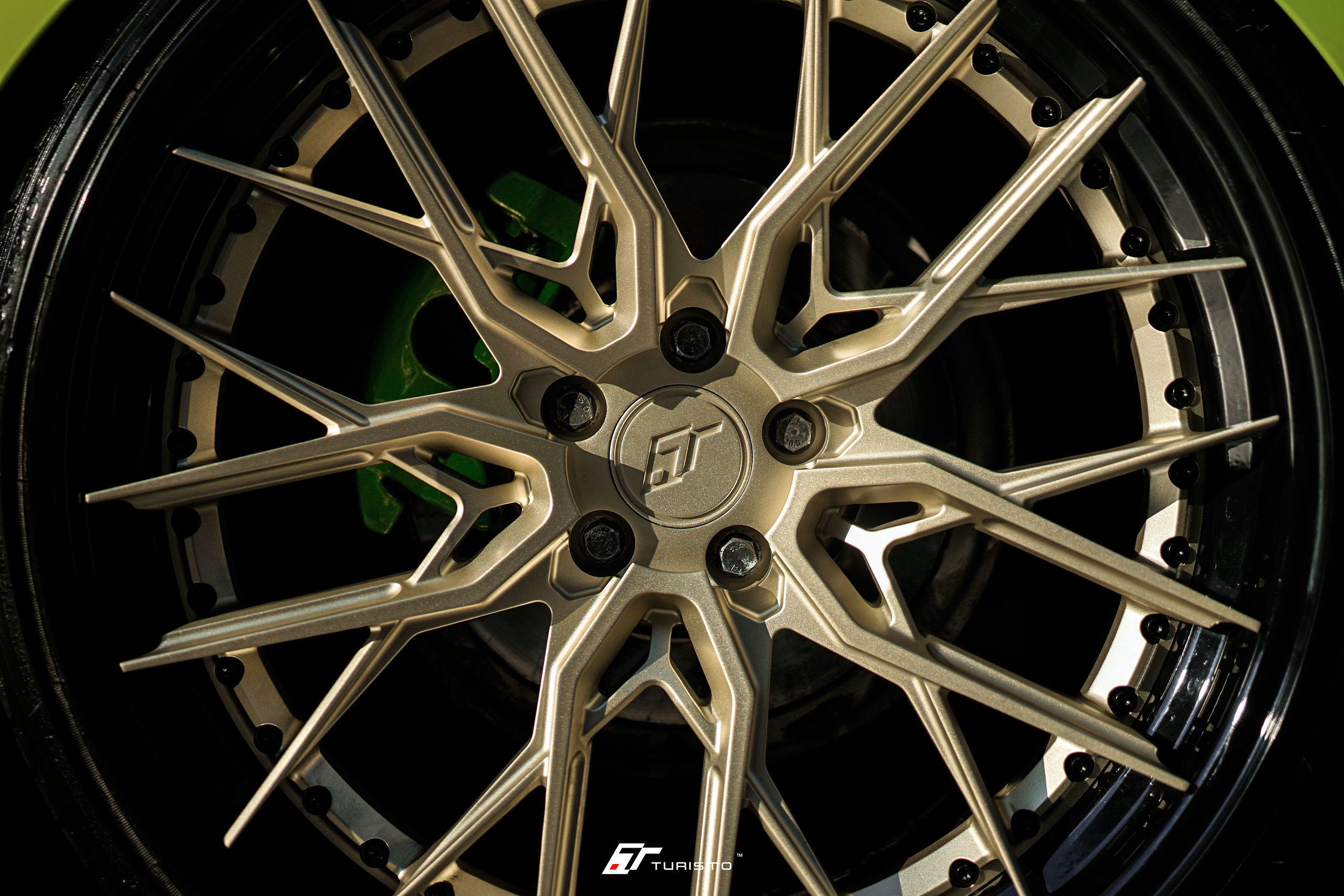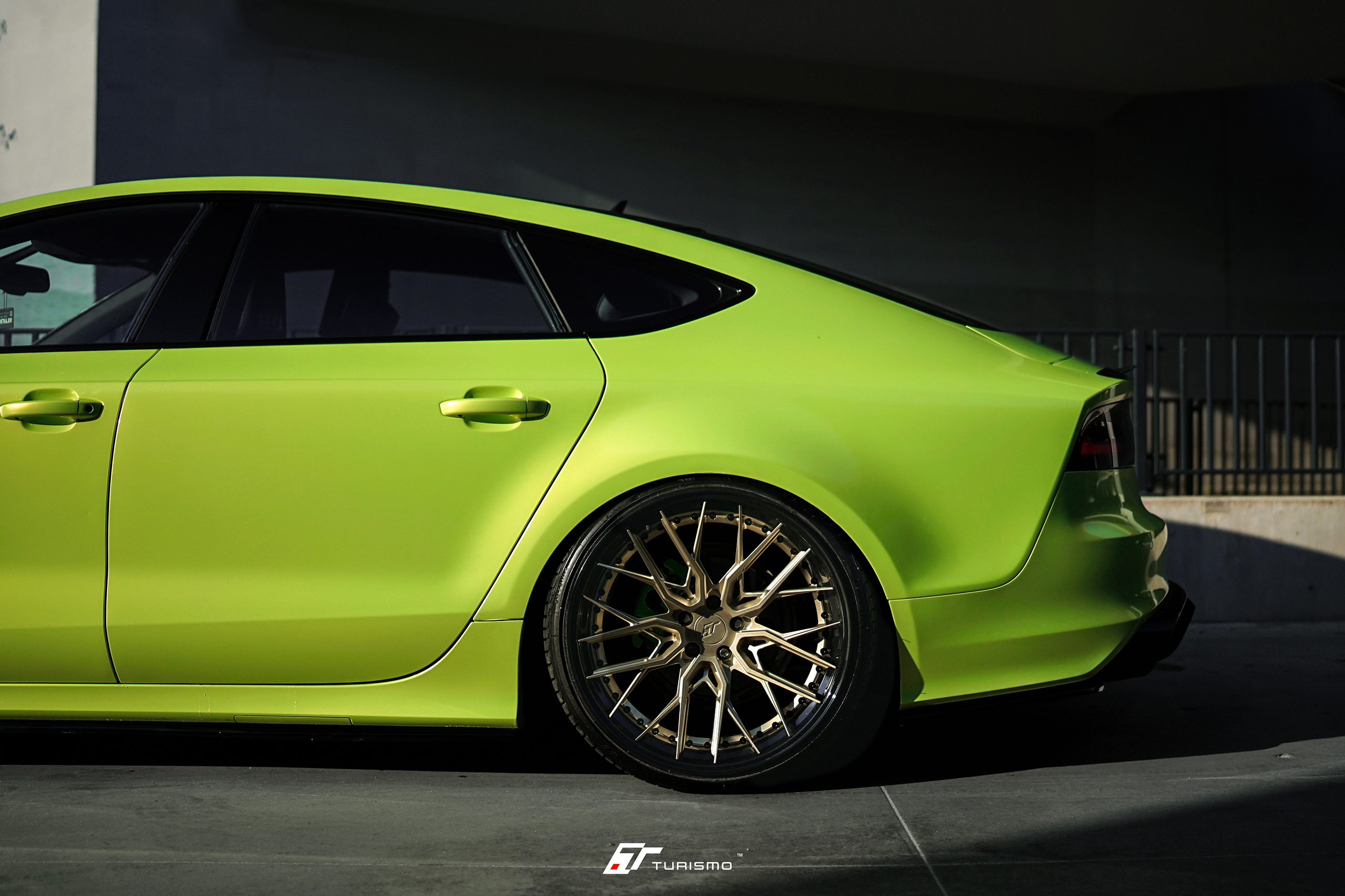 Felgi wykończone zostały w kolorach Satin Champagne Gold (rotor) oraz Gloss Black (rantobęben). Całość doskonale współgra z jaskrawozielonym kolorem nadwozia. W samochodzie został również zamontowany pakiet dokładek Maxton Design oraz moduł obniżający.