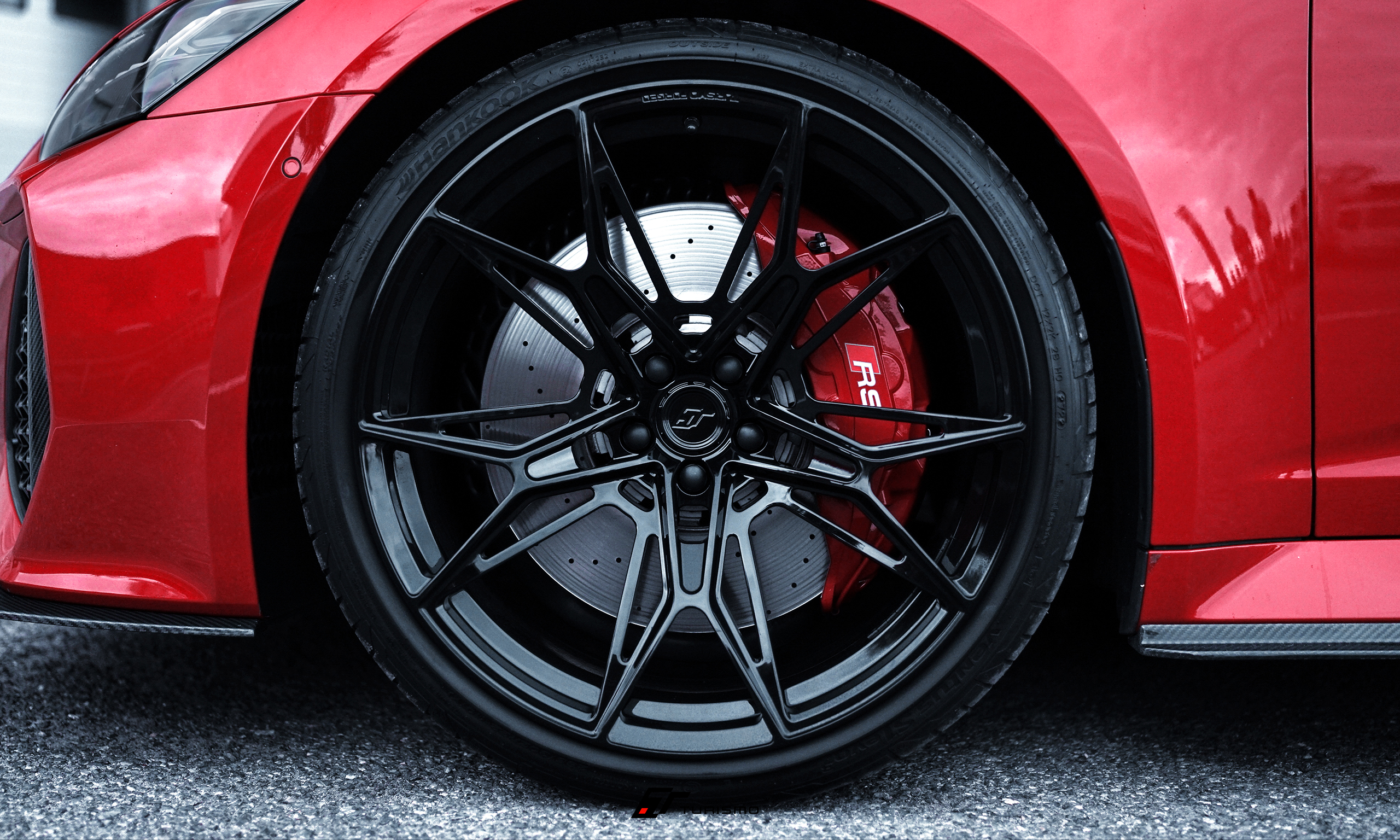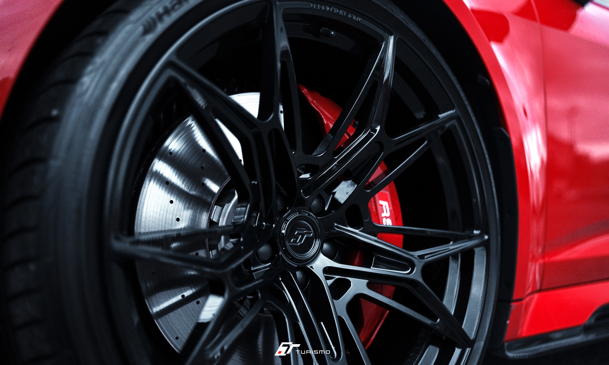 Z uwagi na napęd Quattro, zastosowaliśmy tutaj cztery jednakowe felgi o szerokości 10,5″ każda. Felgi wykończyliśmy w kolorze połyskliwej czerni (ang. Gloss Black), która idealnie komponuje się z żywą czerwienią nadwozia pojazdu. Na życzenie właściciela, odsadzenie felgi od piasty (ET) pozostawiliśmy w seryjnym parametrze.