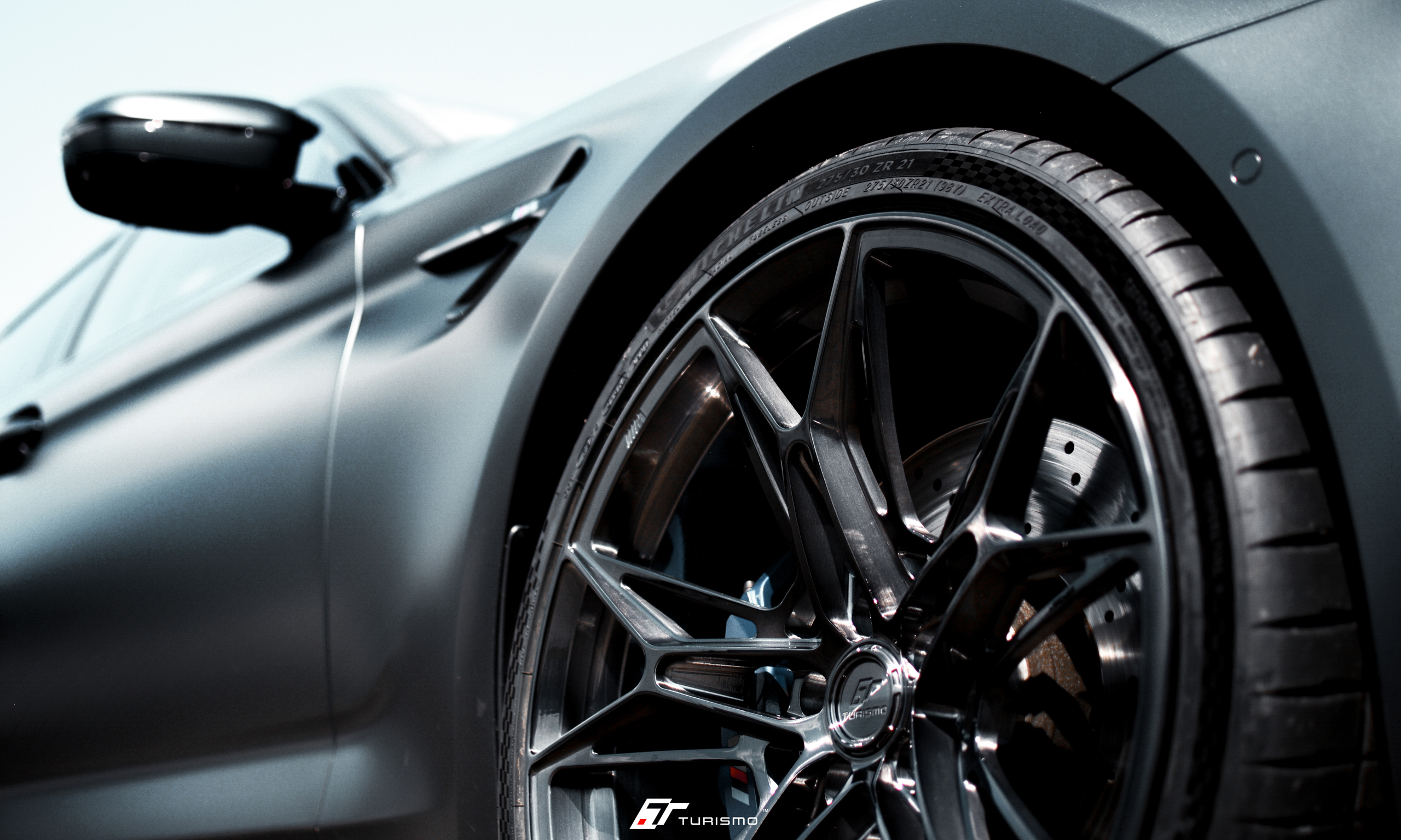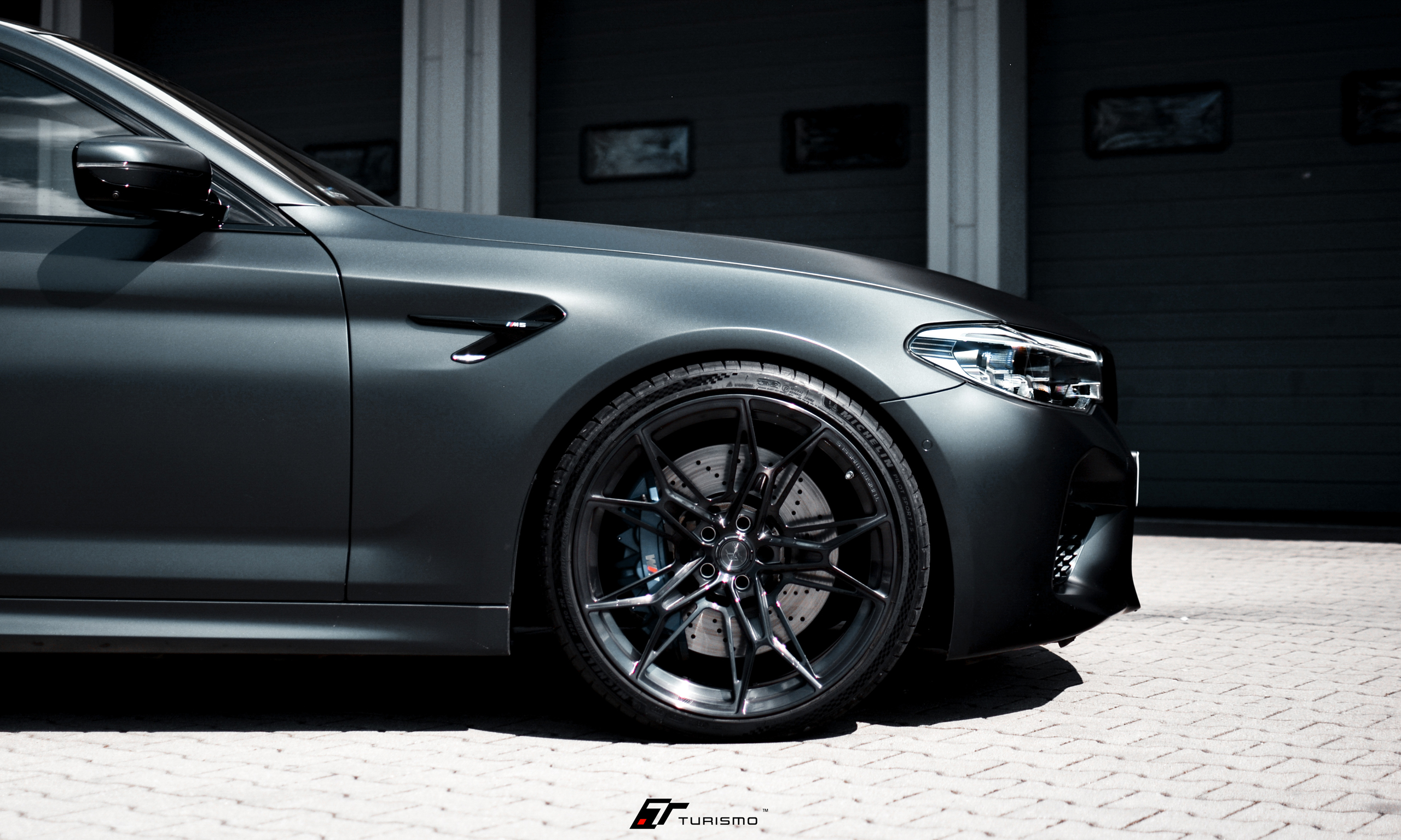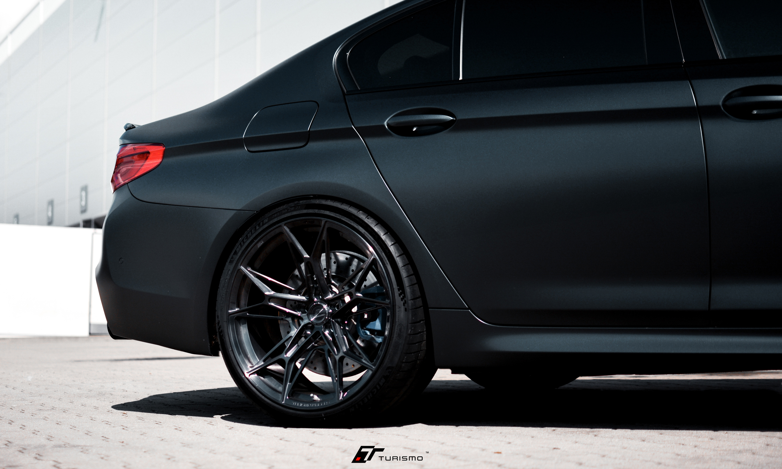 Felgi Turismo Forged C01 w kolorze Brushed Deep Black idealnie zgrały się z elegancką linią nadwozia, którą dodatkowo podkreślono satynową folią o ciemno-grafitowym odcieniu. Na życzenie klienta, spersonalizowaliśmy także obręcz felgi, dodając na niej emblemat M.