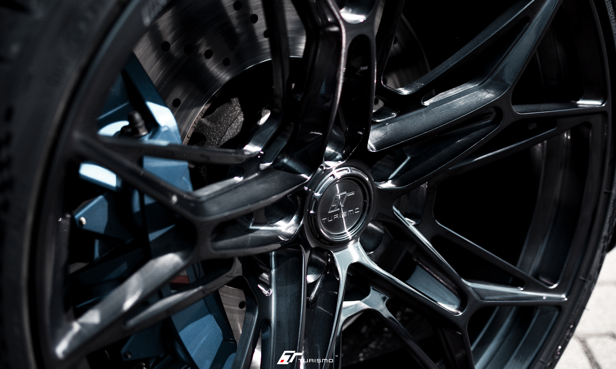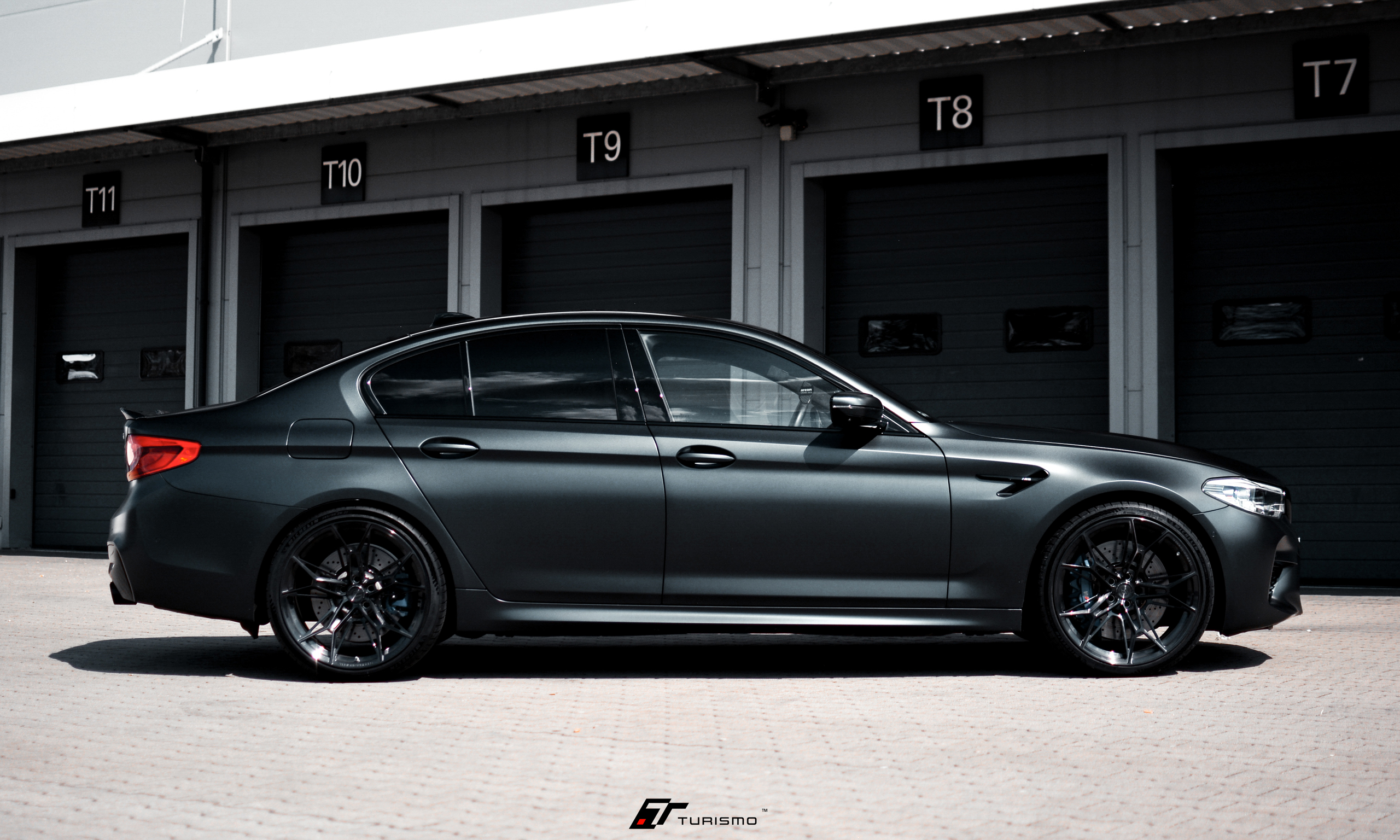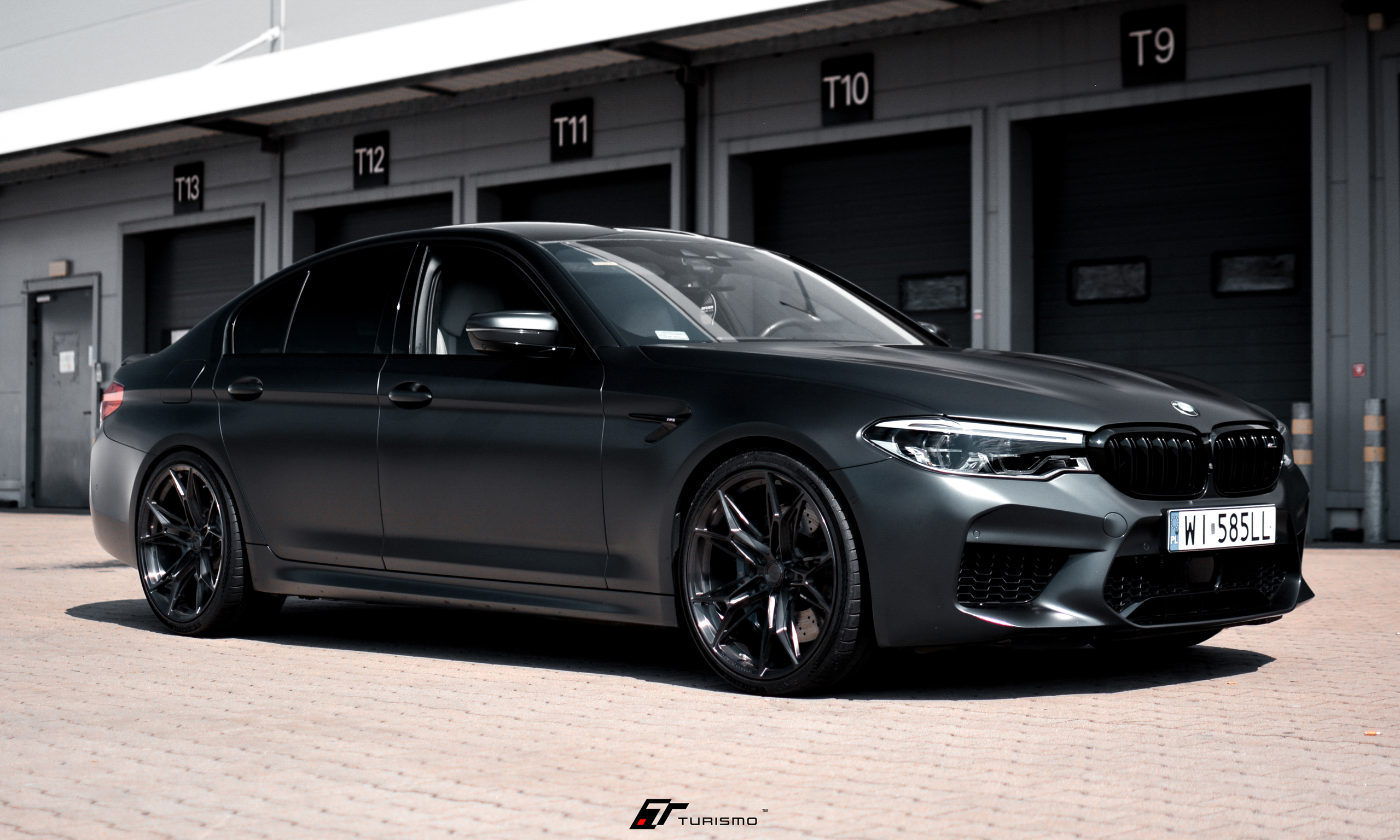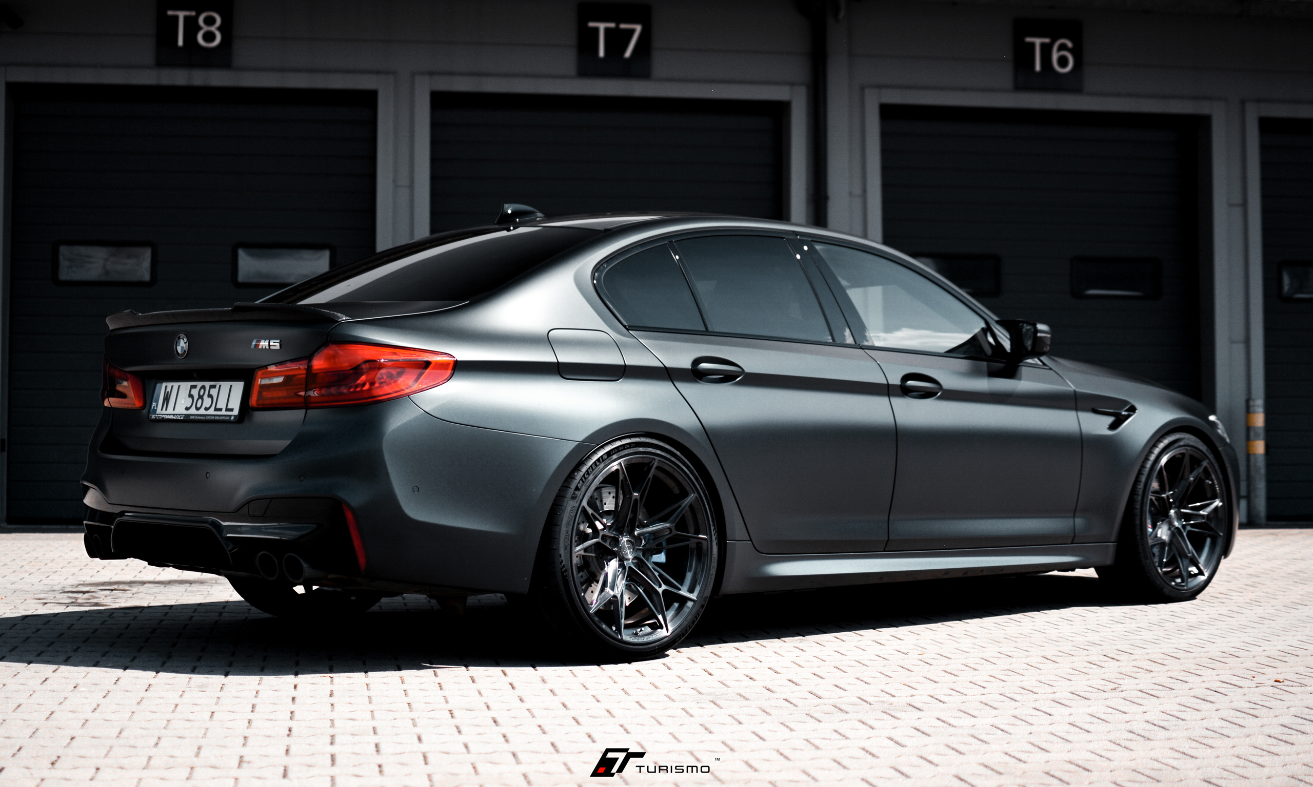 Felgi Turismo Forged C01 w kolorze Brushed Deep Black idealnie zgrały się z elegancką linią nadwozia, którą dodatkowo podkreślono satynową folią o ciemno-grafitowym odcieniu. Na życzenie klienta, spersonalizowaliśmy także obręcz felgi, dodając na niej emblemat M.
