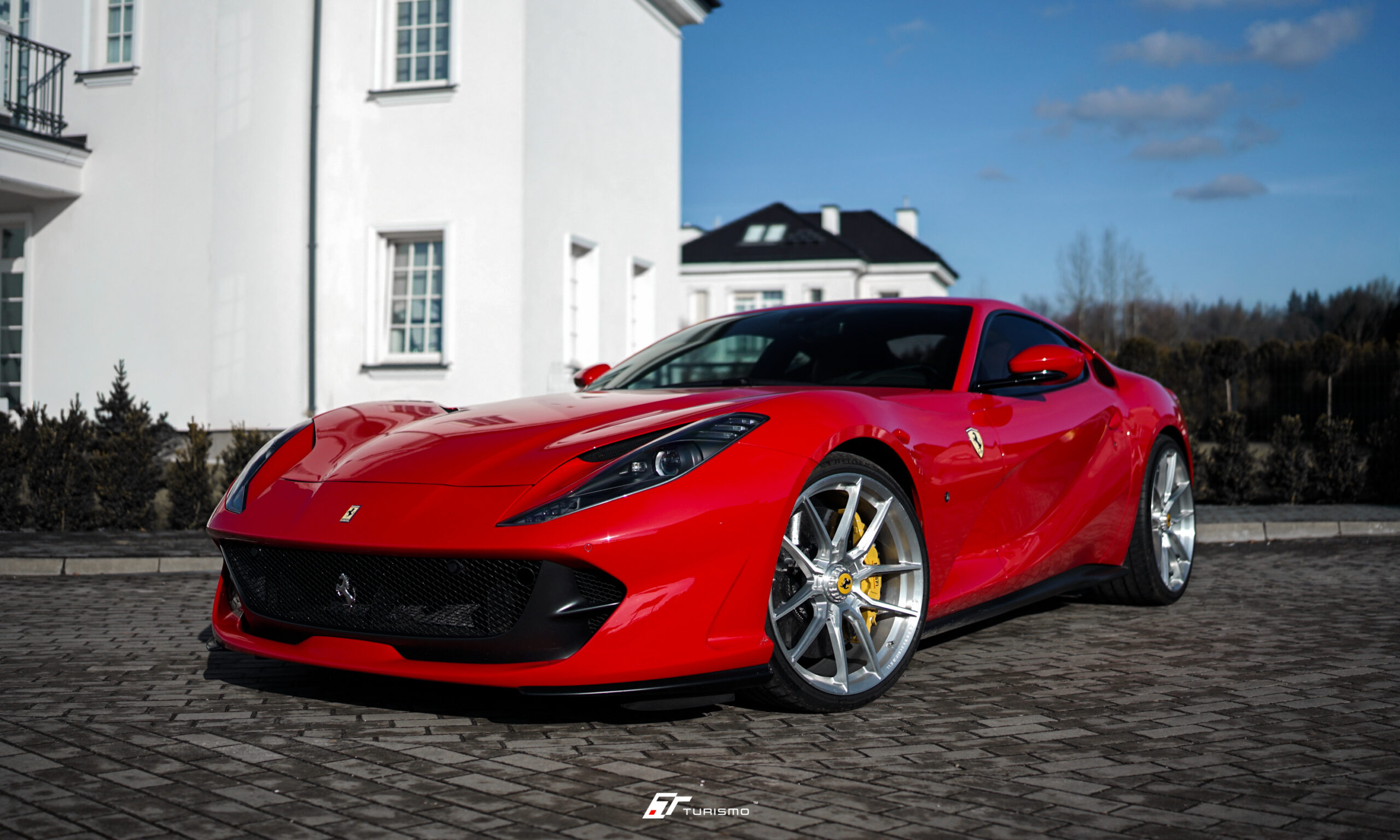 Czerwone Ferrari 812 Superfast z żółtymi zaciskami hamulcowymi wyposażyliśmy w felgi aluminiowe Turismo Forged F80. Wybraliśmy wykończenie typu Brushed Alu (szczotkowane aluminium), które podkreśla surowy, techniczny charakter kutej struktury i doskonale kontrastuje z klasycznym lakierem nadwozia.
