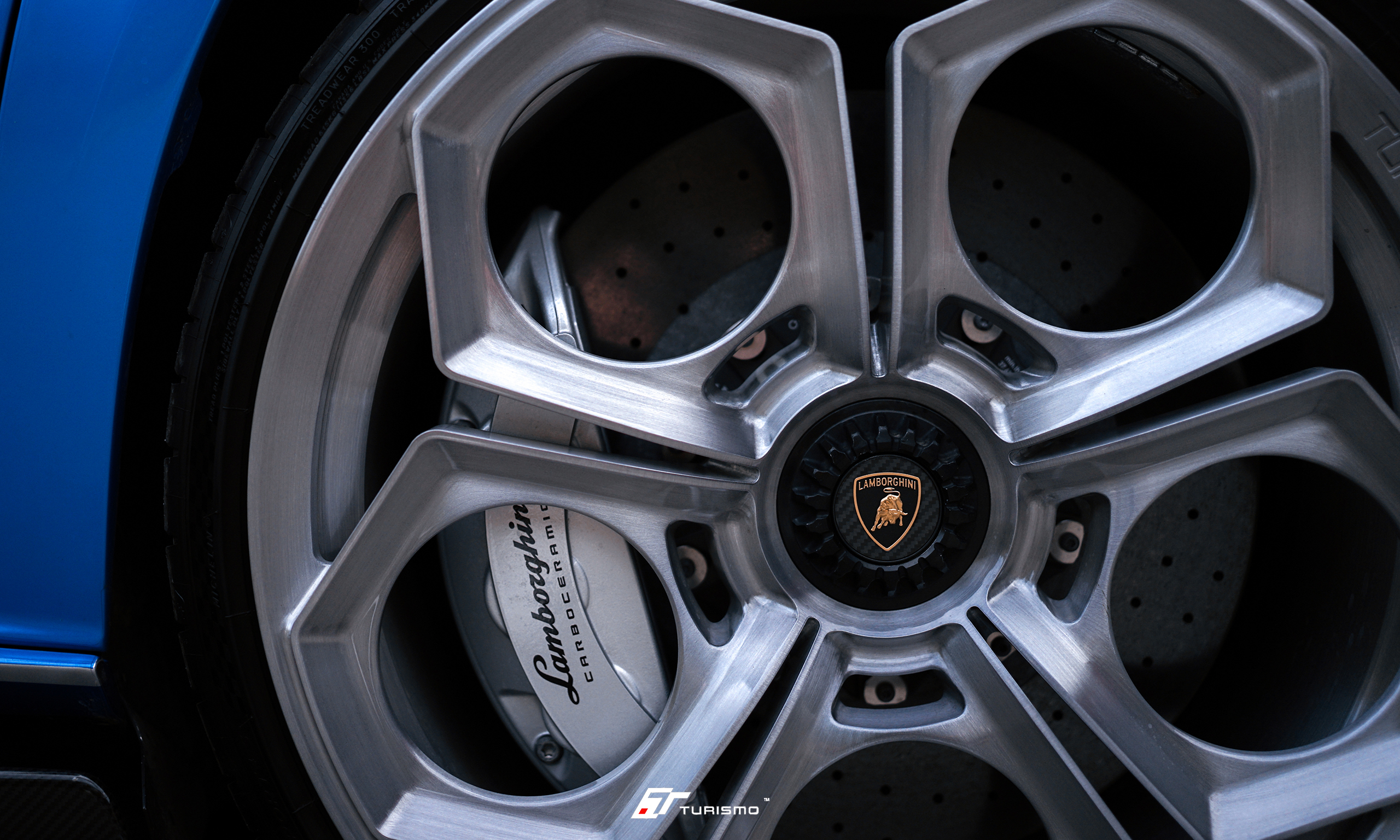Lambo otrzymało 20″ felgę z przodu o szerokości 9″, natomiast na tyle umieściliśmy 21″ felgę o szerokości 12,5″. Felgi zostały wykonane w ekskluzywnym wykończeniu Brushed Alu, które idealnie komponuje się niebieskim kolorem karoserii.