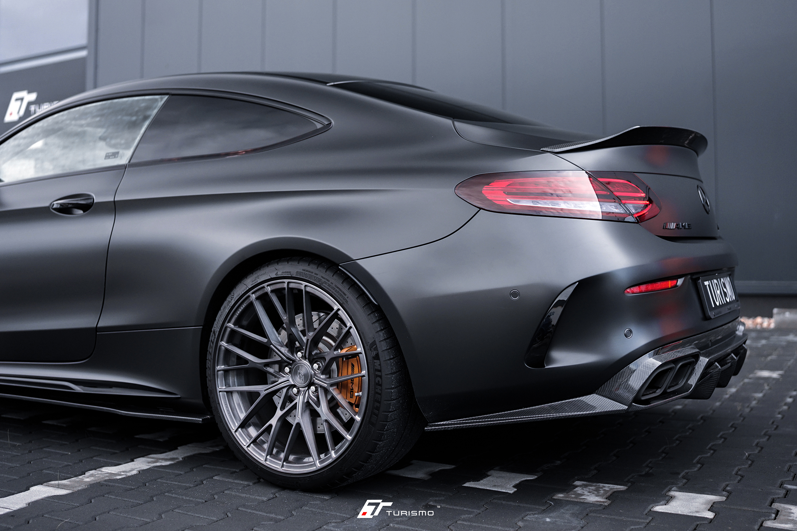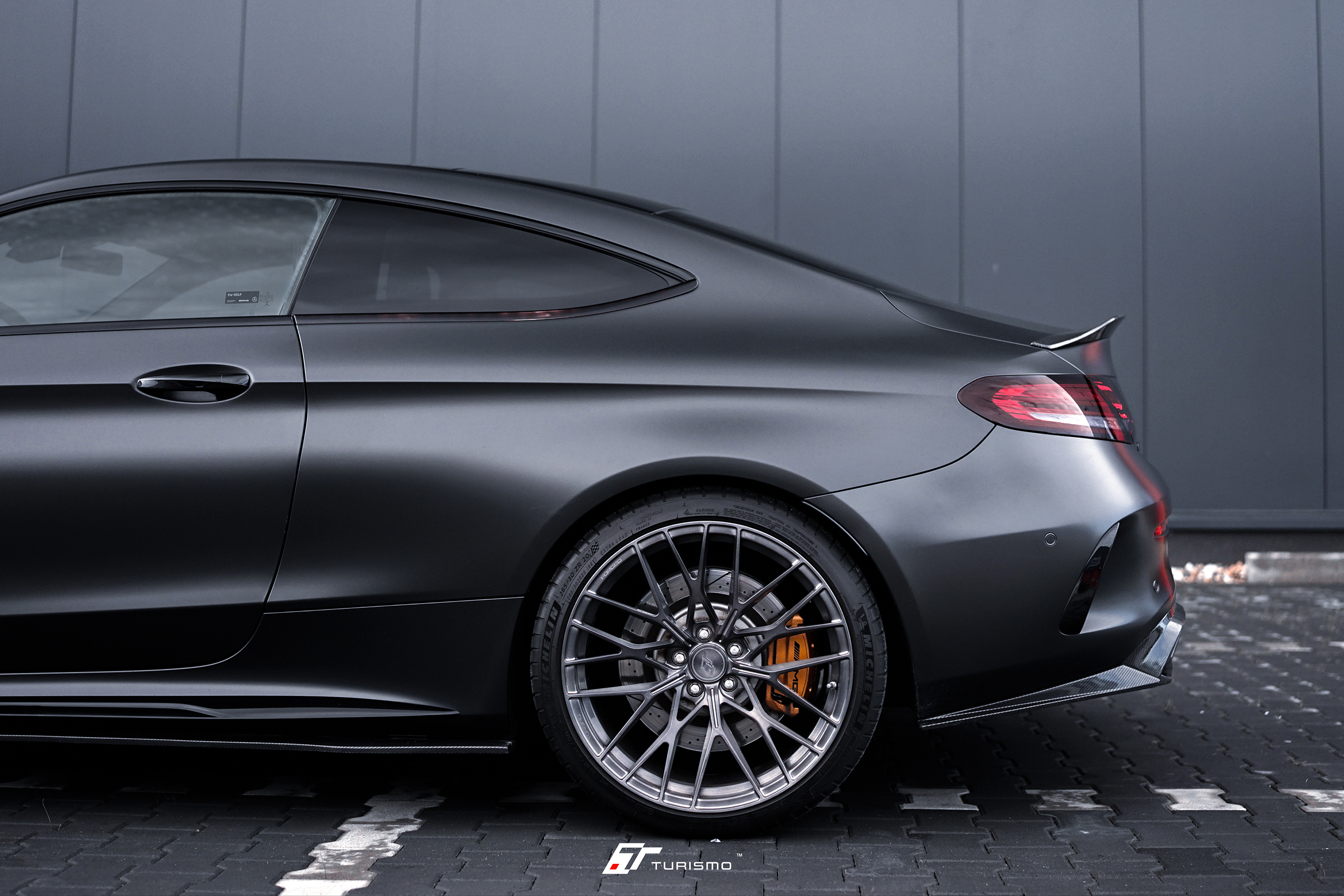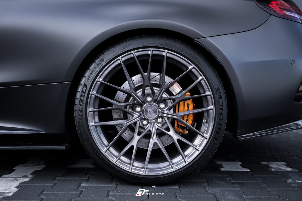Mercedes-Benz C63S AMG C205, wyposażony w wyjątkowy zestaw 20-calowych felg Turismo Forged TF02. Felgi w strukturze szczotkowanej, pokryte lakierem transparentnym “deep black” . Głęboki, ciemny odcień idealnie komponuje się z nowym, satynowym kolorem nadwozia, tworząc harmonijną i spójną całość.