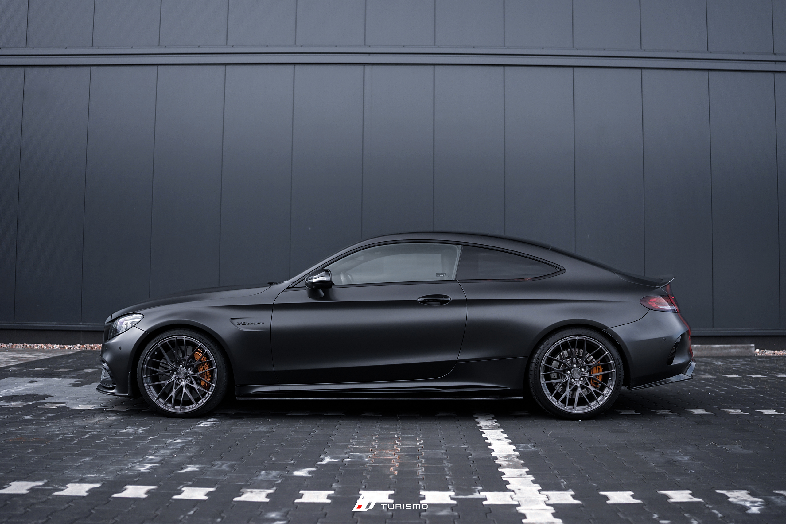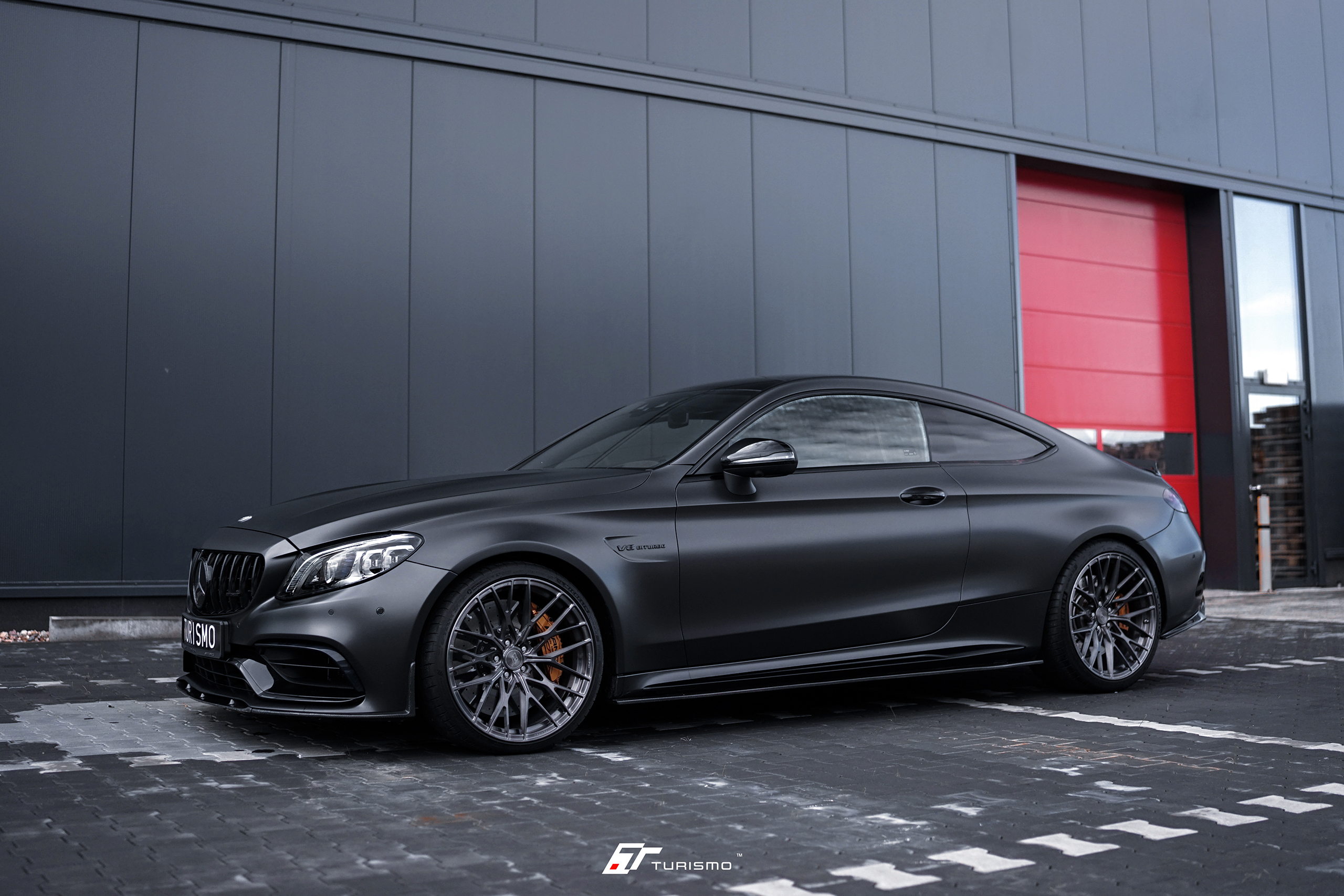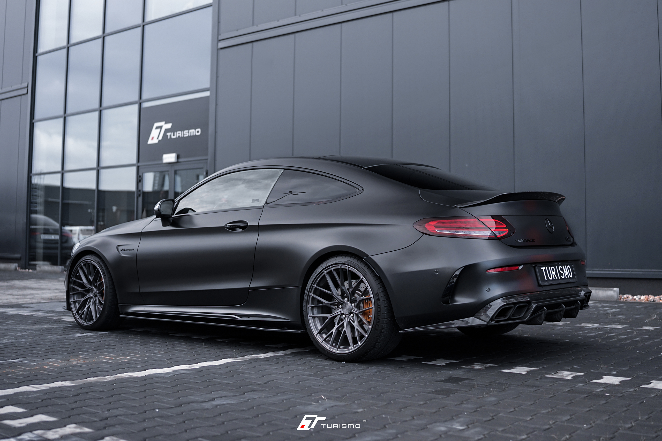 Mercedes-Benz C63S AMG C205, wyposażony w wyjątkowy zestaw 20-calowych felg Turismo Forged TF02. Felgi w strukturze szczotkowanej, pokryte lakierem transparentnym “deep black” . Głęboki, ciemny odcień idealnie komponuje się z nowym, satynowym kolorem nadwozia, tworząc harmonijną i spójną całość.