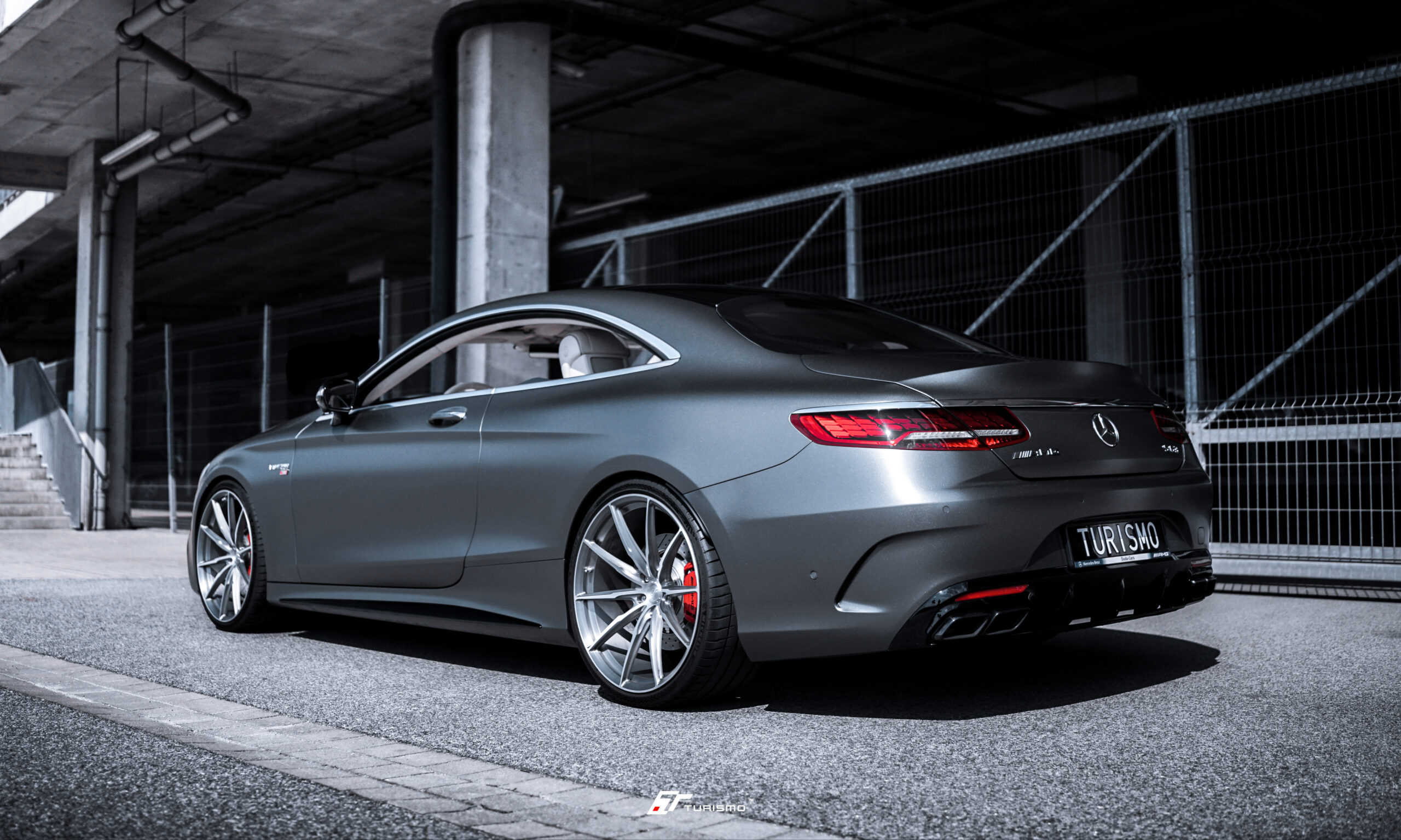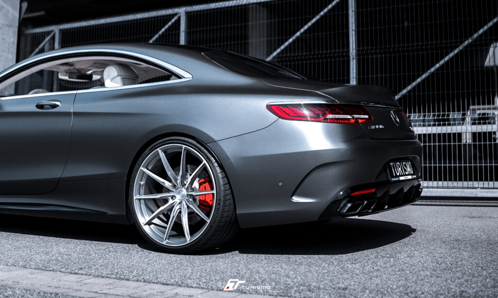 Mercedes-Benz S Coupe S63 AMG C217 BRABUS, którego wyposażyliśmy w kute felgi aluminiowe Turismo Forged C03. Na osi przedniej zamontowaliśmy felgi o rozmiarze 22x9J, a na tylnej 22×10.5J. Obręcze zostały wykonane w podwójnym wykończeniu – wewnętrzna część felgi (bęben) została polakierowana w czarną satynę, natomiast front felgi wykończono w strukturze szczotkowanego aluminium (tzw. „brushed face”).